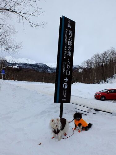 乗鞍に立派な氷瀑があるというので行ってみました。 スキー場近くに善五郎の滝への入り口を発見。 お日様が雲に隠れてかなり寒いので、チャココもブーツとダウンで完全防備。 白樺林の中の遊歩道は、圧雪されているのでスノーシューなしでOKでした。 15分ほ…