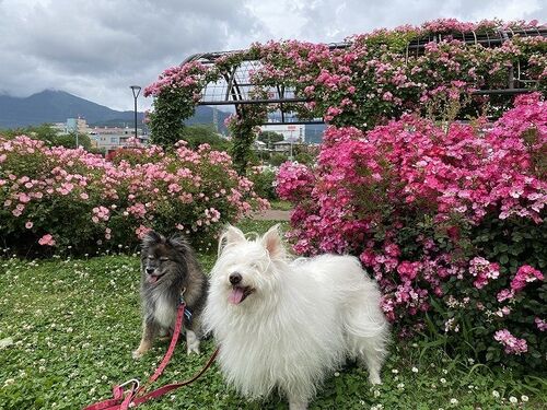 近くの秦野運動公園に散歩に来たら、バラ園が満開。 芸術作品みたい。 「とってもキレイだワン!」 バラの香りに包まれて、とっても癒されました。
